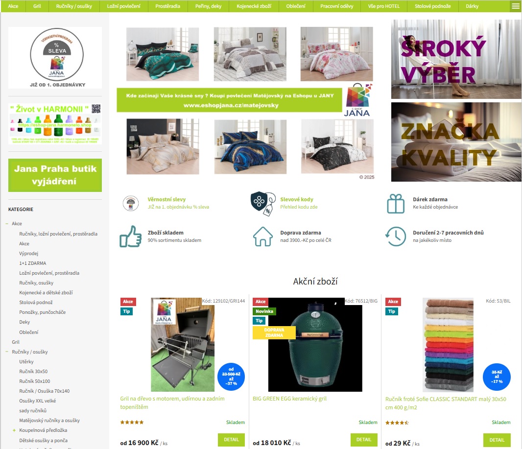 Nahlédnout můžete i na náš E-shop Jana s nabídkou různého kvalitního zboží české výroby. Najdete u nás nejen povlečení a prostěradla značek Matějovský, DADKA, BROTEX, matracový chránič, polštáře, přikrývky – vše za velmi příjemné příznivé ceny. Staňte se naším věrným zákazníkem, vytvořte si u nás účet a my Vás za Vaše objednávky ihned odměníme.